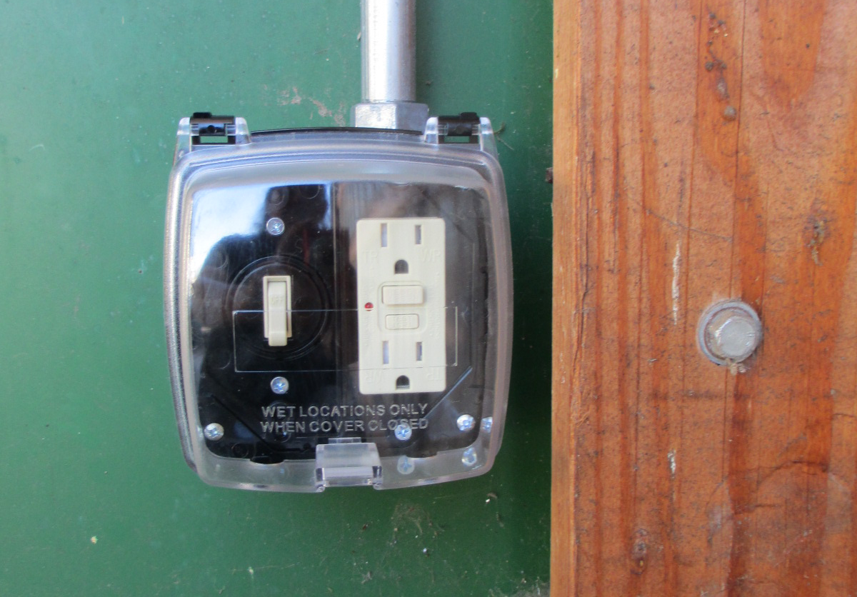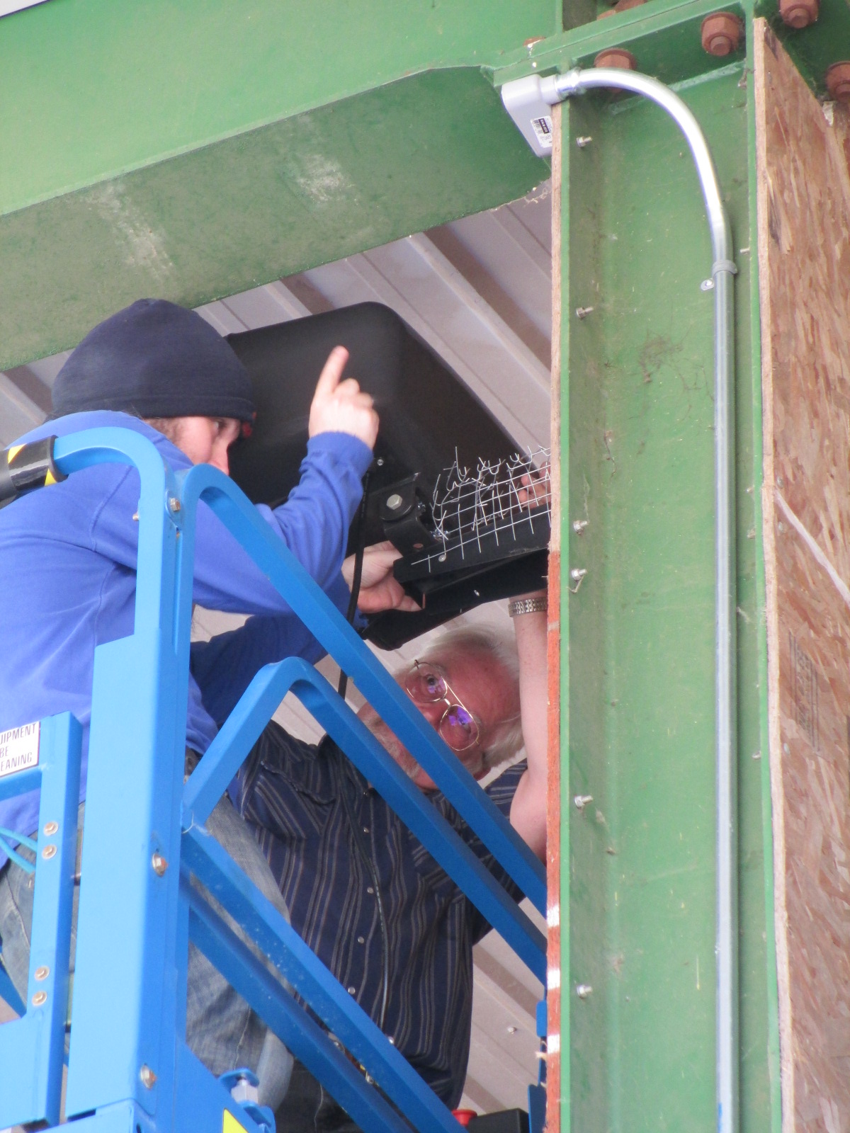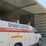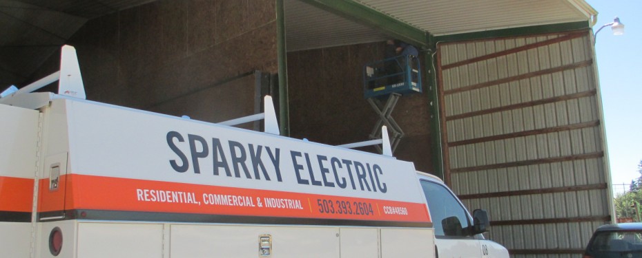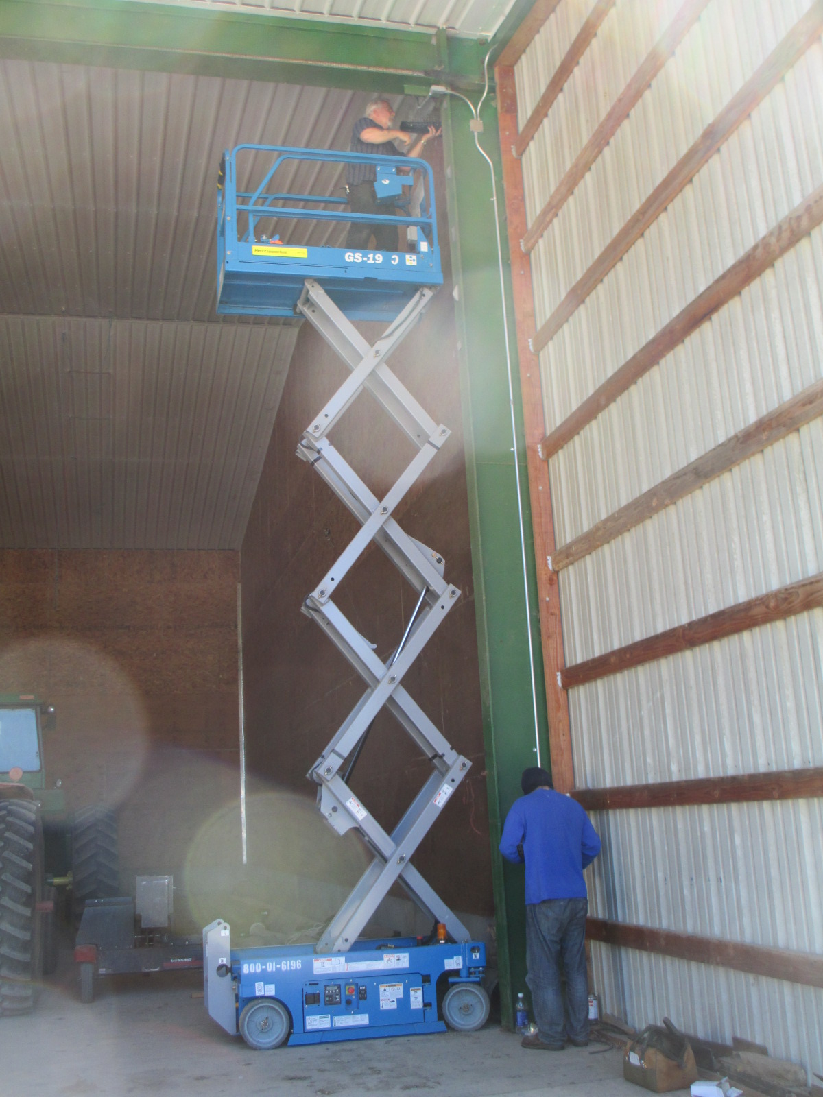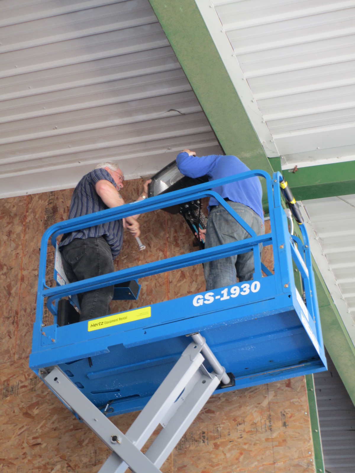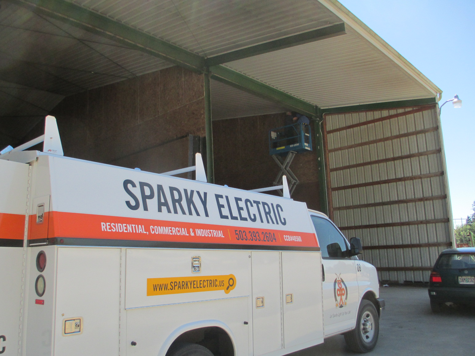 Sparky Electric installed 250 watt metal halide flood lights in each bay of this large five-bay farm equipment building. Switches and convenience outlets were mounted to the face of the steel structure stations separating the bays. A 175 watt HPS security light was mounted at each of the front two corners of the 30 foot overhang to light the covered concrete pad area. All work was done using a 19 foot scissor lift.